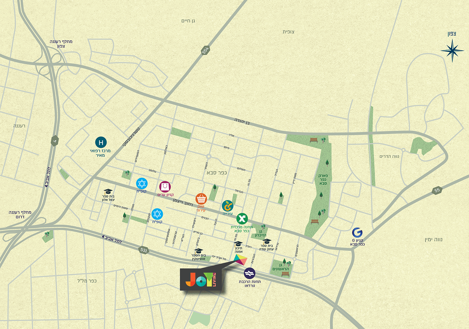 JOY LIVING שוכן במיקום מרכזי ומבוקש בכפר סבא. רק 5 דקות הליכה מרחוב ויצמן וקניון ערים, ובמרחק פסיעה ממתחמי הבילוי של G כפר סבא ואושילנד. נגישות גבוהה לצירי התחבורה המרכזיים כמו כביש 531 , מרחק הליכה מהתחנה המרכזית, תחנת הרכבת "נורדאו" ומהתחנה העתידית של המטרו.